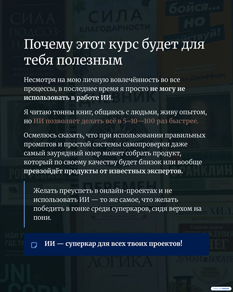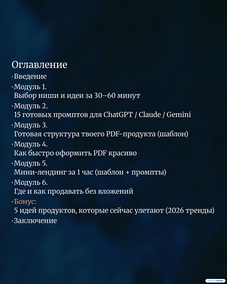 Не курс и не теория. Полная система создания цифрового продукта, где ИИ генерирует тексты, структуру и идеи, а ты получаешь готовый продающий продукт.